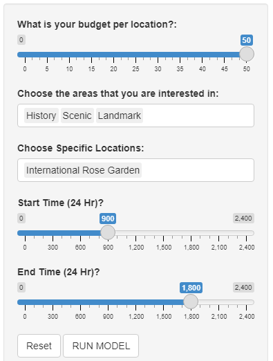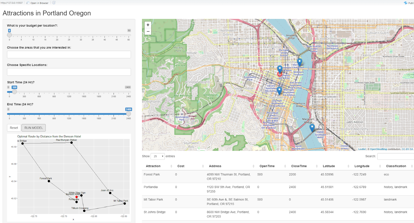 In the 21st century’s world of technology, finding unique places to travel should be easy. However, it is often a hassle to find enough clear information to make a simple itinerary in these desirable destinations. In addition to this, the pandemic has diminished traveling/tourism tremendously, along with numerous other reasons throughout the world. However, that is all about to change in Portland, Oregon, United States. Tourbella Travel Company, located in Portland, Oregon, has initiated a collaboration with our consulting firm to design an optimal method for traveling and touring itineraries in Portland. There will be over 51 locations available for the traveler or tourist to evaluate the best experience. Tourism Route Optimization for a Portland, Oregon Itinerary will consist of the traveler or tourist’s specific requests and information such as the financial requirements, activities, timeframe, distance, and more to model and formulate an ideal itinerary fit for any type of group, with any type of budget. The itinerary uses features from RStudio and Shiny to evaluate specific variables, constraints, and objectives to define the ideal outcome and represent those outcomes simply and effectively to the traveler or tourist. Determining the optimal itinerary uses linear (continuous) and nonlinear (non-continuous) functions, summations between upper and lower bounds with certain variables to find the minimum and maximum information, all being subject to certain constraints. The traveler or tourist will be able to evaluate how to best spend their time, money, and experiences all in a safe, efficient, and straightforward manner, saving them time to have fun on their trip instead. Furthermore, by integrating research, applications such as RStudio & Shiny, planning, mapping and scheduling into one single platform, this allows our collaborative company to create revenue and opportunity by increasing demand for local businesses, thereby improving tourist satisfaction by providing a link to Portland’s historical destinations, activities within, and attractions sure to capture anyone’s interests.